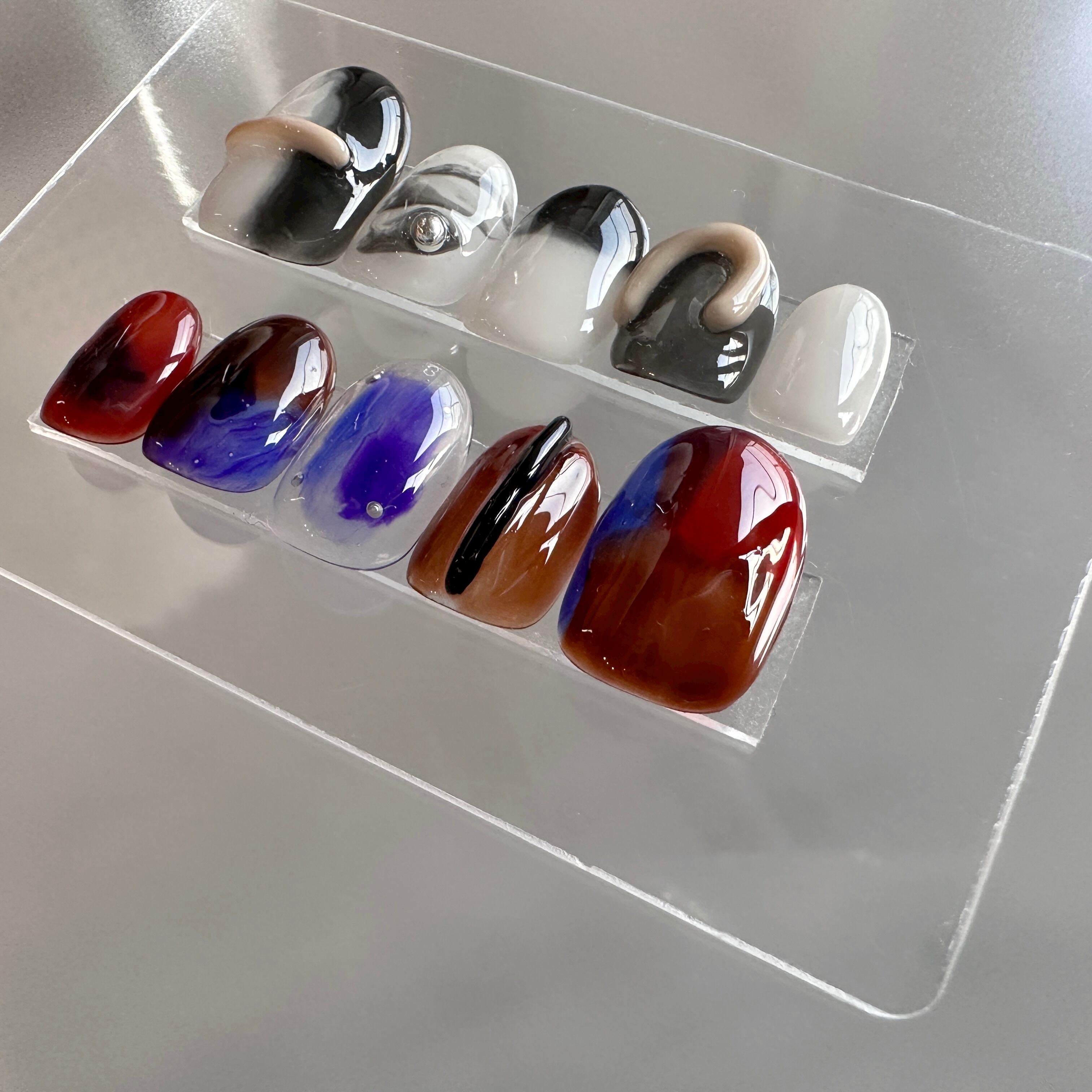 クリアベースに、右手はモノトーン、左手はカラフルにデザインしました。